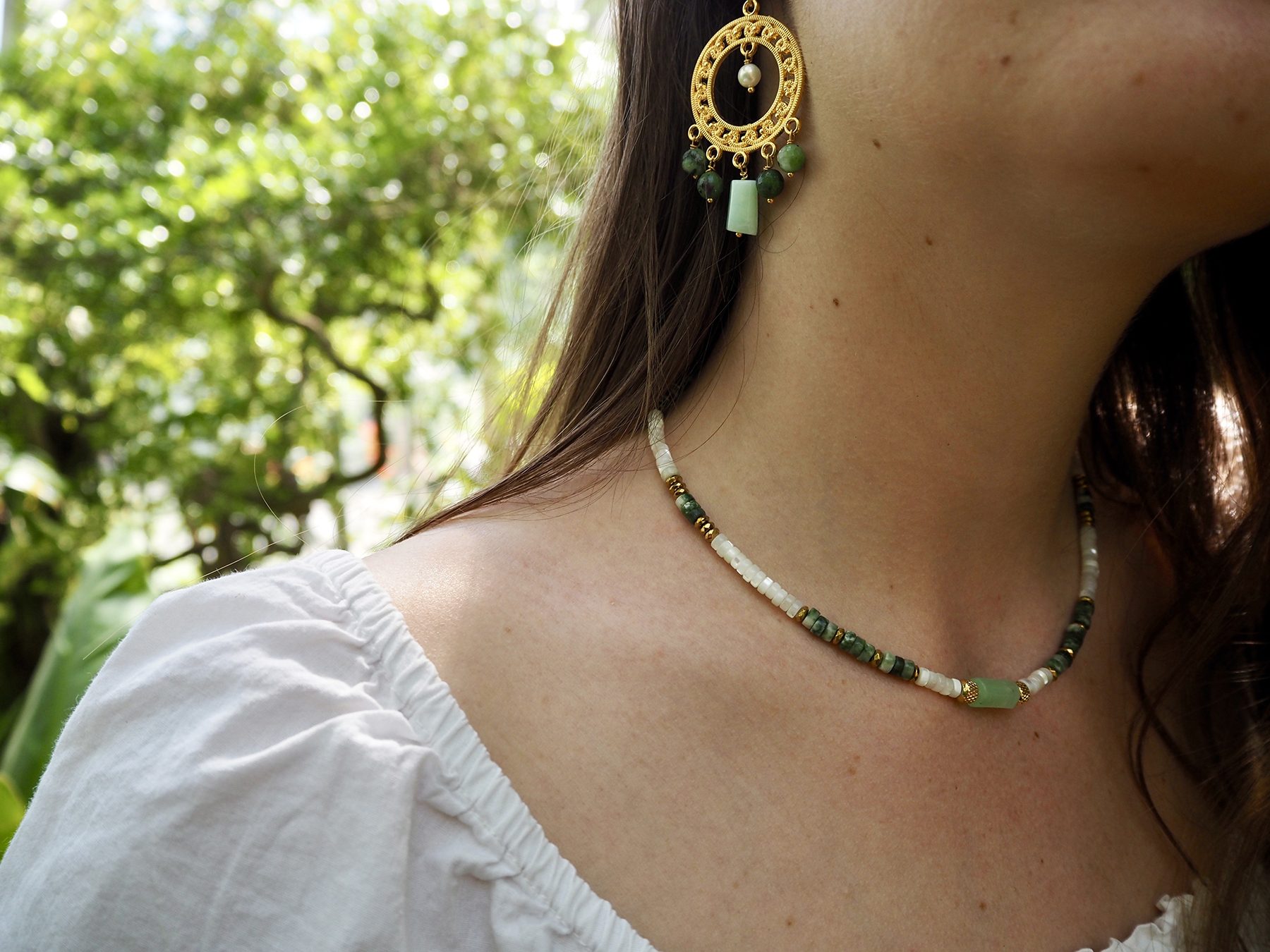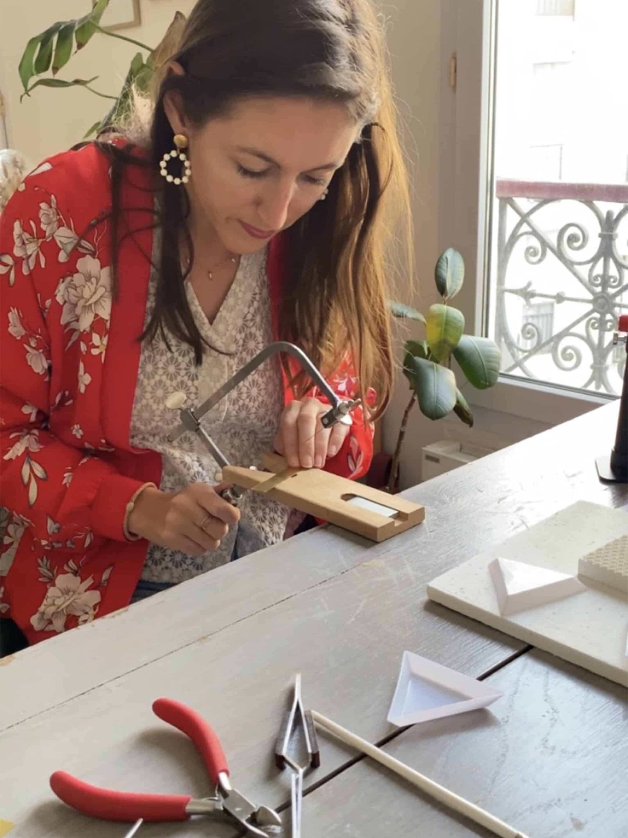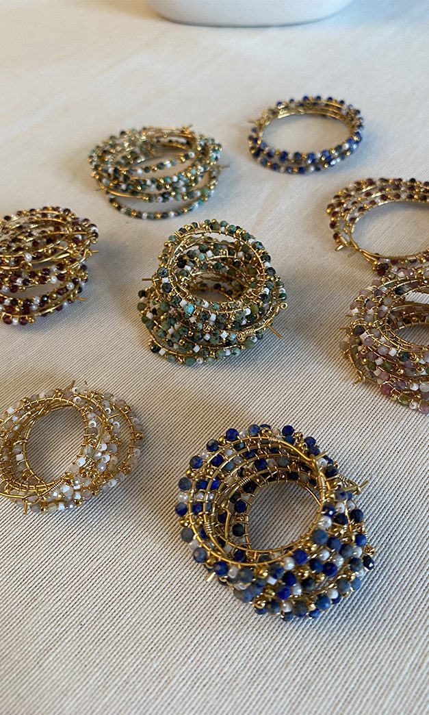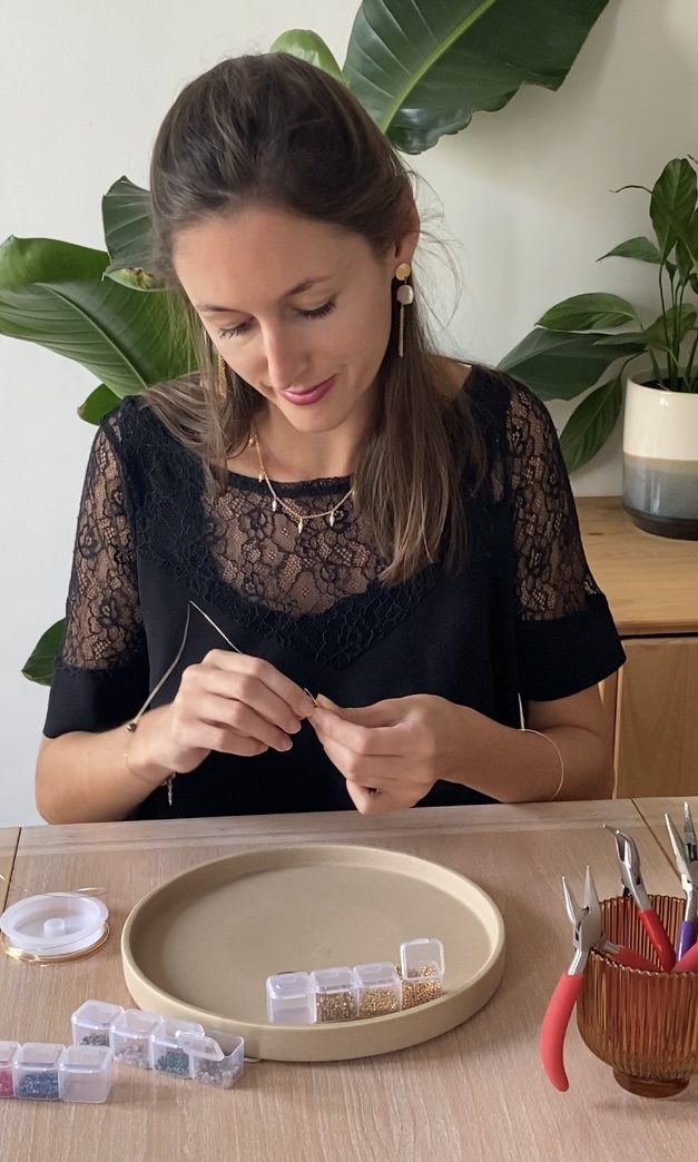Chaque bijou est imaginé, dessiné et fabriqué par mes soins dans mon atelier. J’utilise du plaqué or, de l’or laminé 14k, des perles d’eau douce et des pierres fines, et je fabrique la plupart des pièces à la commande pour limiter le gaspillage.