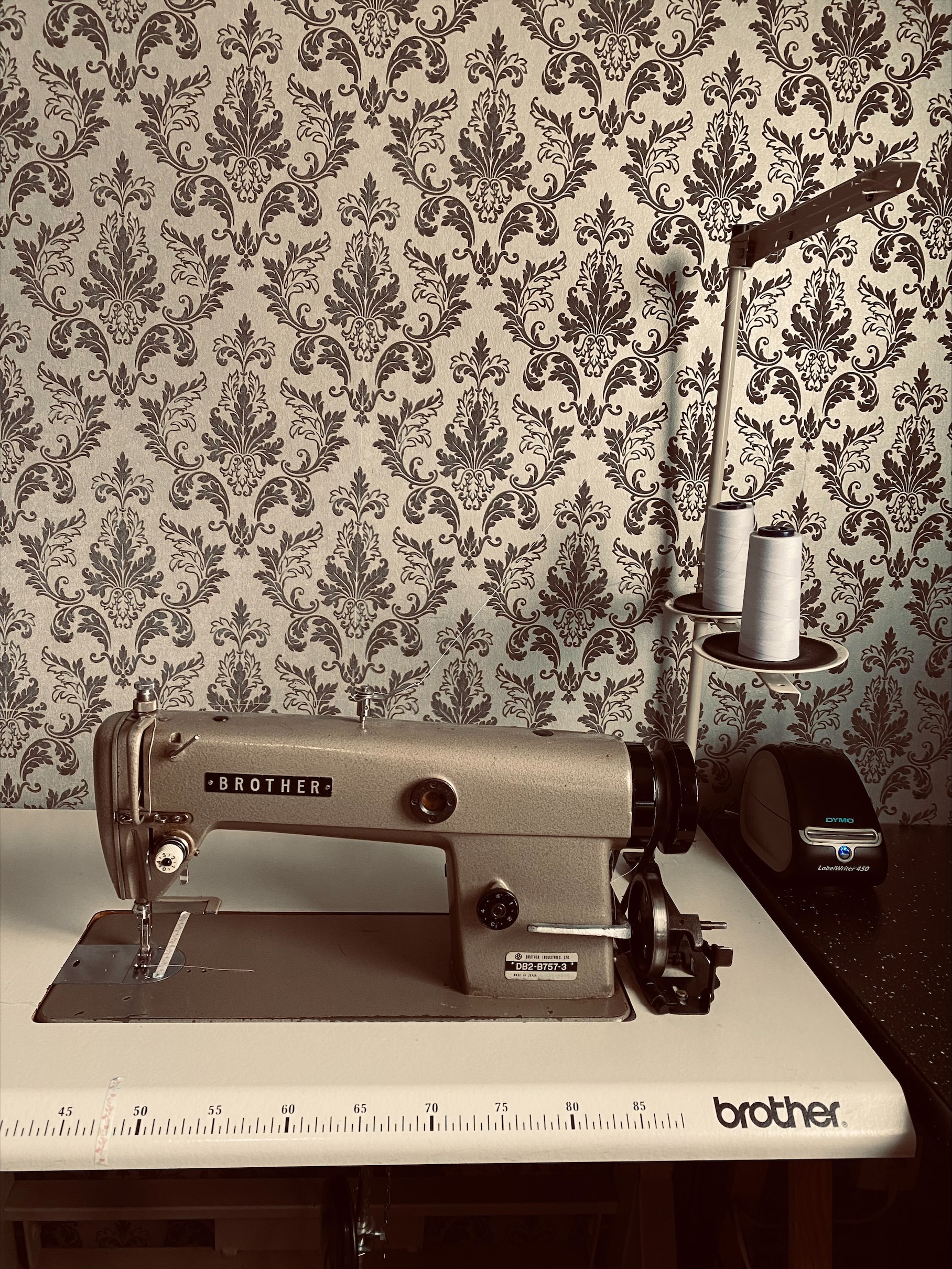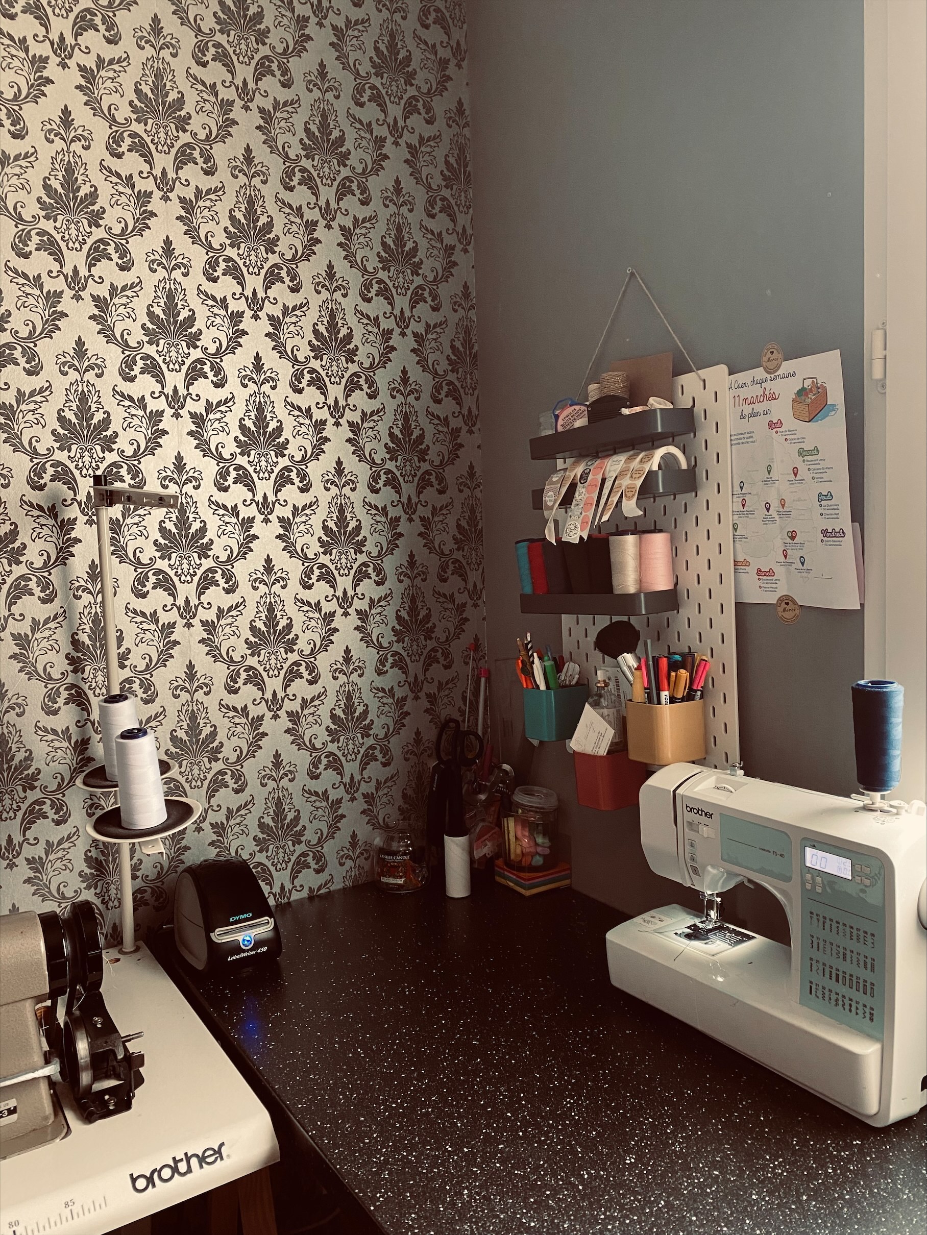 Dans mon petit atelier d’une dizaine de m2, je travaille seule. Je suis équipée de différentes machines à coudre, j’utilise principalement ma machine industrielle qui me permet d’avoir des coutures au top et des finitions à la limite du parfait.