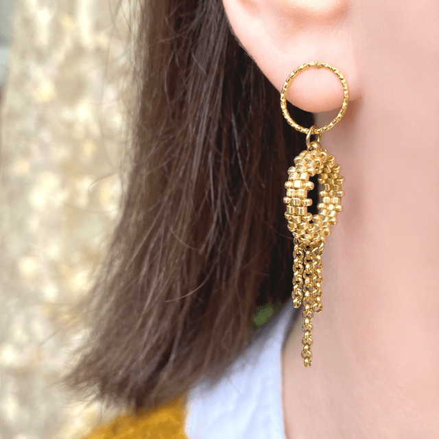 Les boucles d’oreilles Lipaz sont des issues da la collection de bijoux d’Amhé. Elles allient la structure sculpturale du tissage à la souplesse délicate de chaînes dorées.
