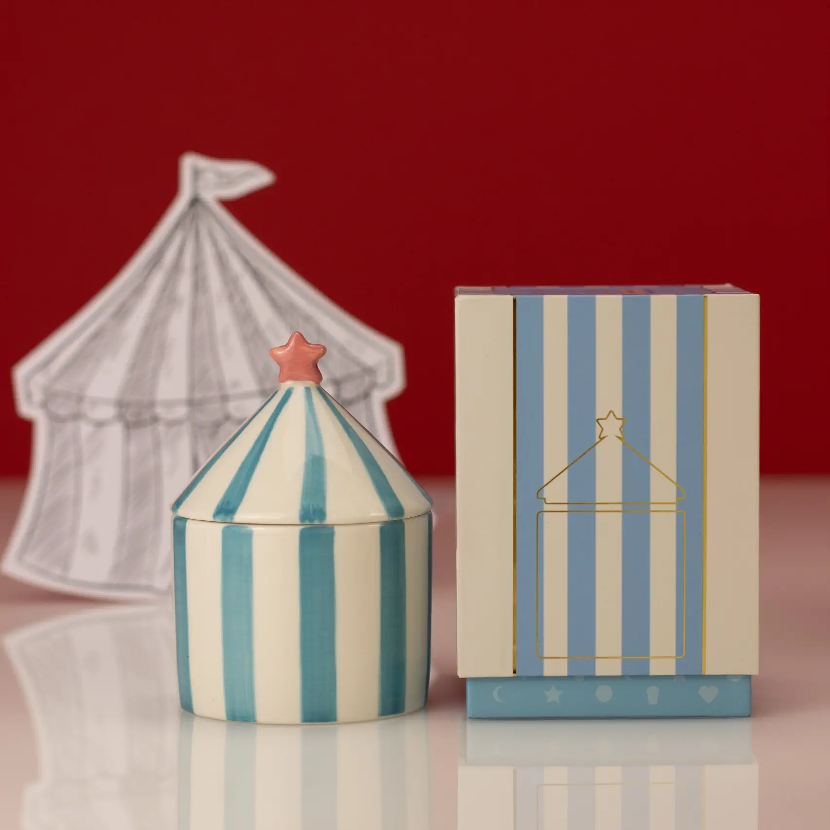 Logée dans un contenant en céramique rayé inspiré d’un chapiteau de cirque classique, la Bougie cirque – Bleue avec couvercle apporte un charme ludique grâce à ses rayures tendance qui valorisent n’importe quel espace. Faisant partie de la collection Cirque, elle est autant un objet décoratif qu’une bougie. Une fois que le mélange parfumé frais s’est consumé, le pot peut être réutilisé comme boîte souvenir ou élément de décoration.