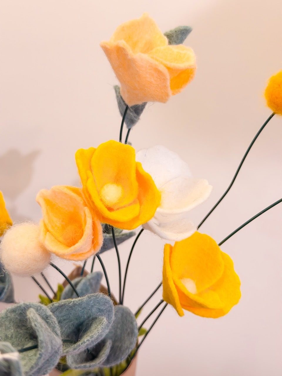 Bouquet feutrine – Jaune et orange est un bouquet fait en Normandie avec de la feutrine de laine.