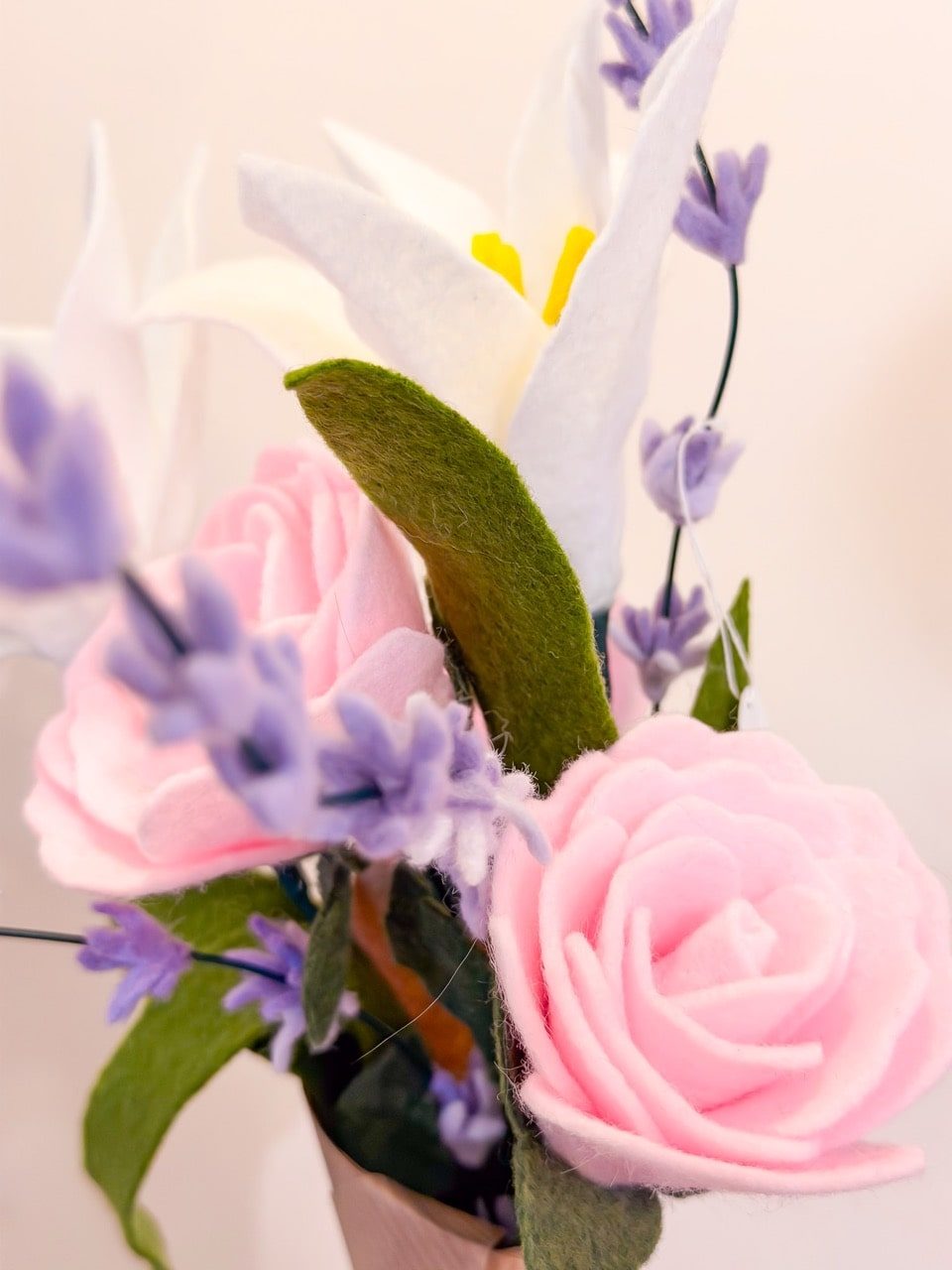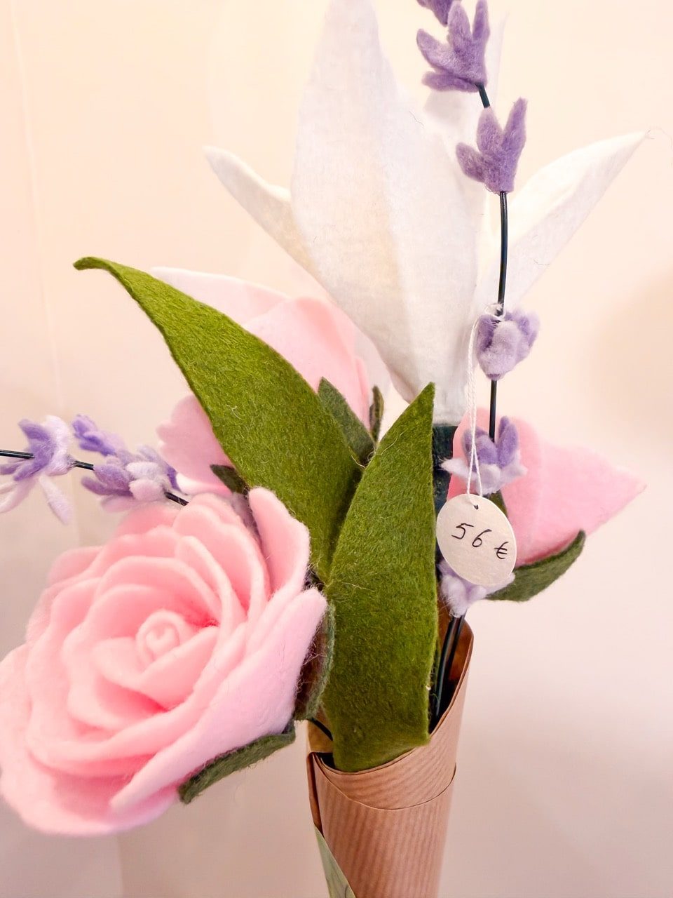 Bouquet feutrine – Rose et violet est un bouquet fait en Normandie avec de la feutrine de laine.