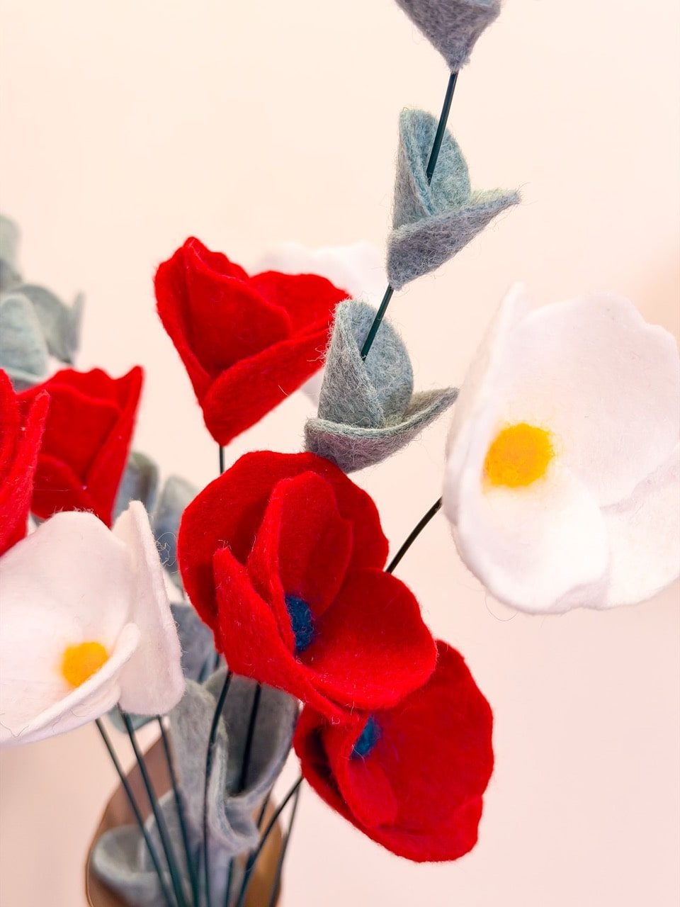 Bouquet feutrine – Rouge et blanc est un bouquet fait en Normandie avec de la feutrine de laine.