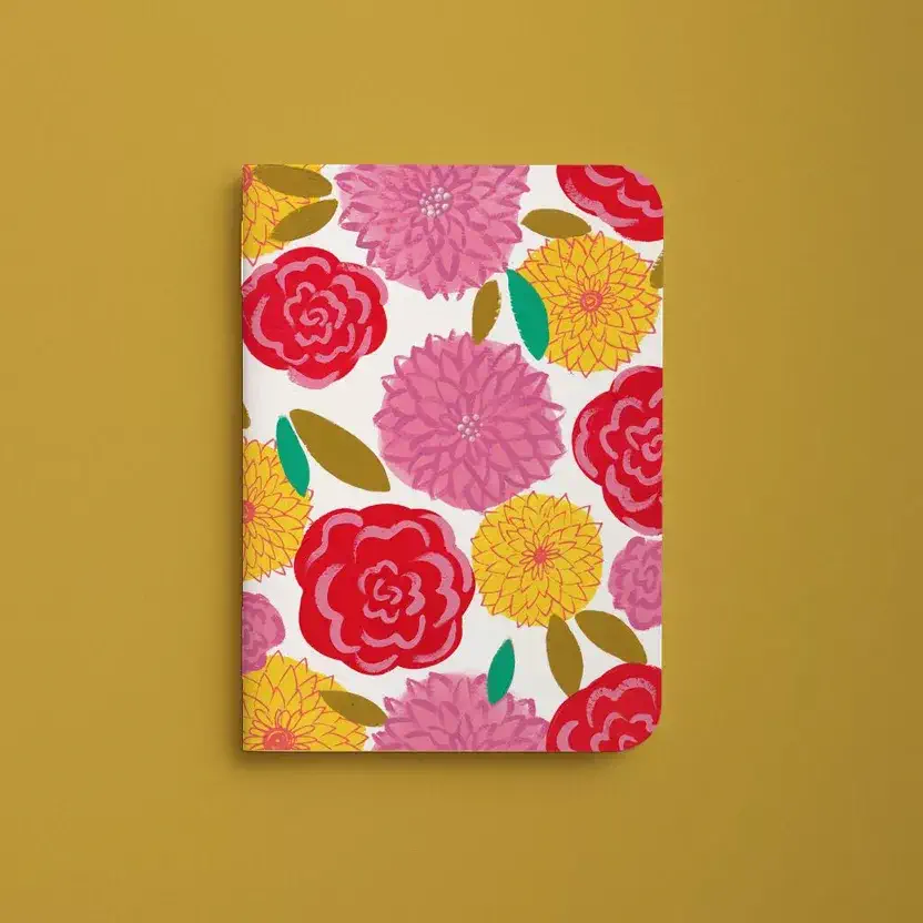Ce carnet célèbre la beauté des dahlias, fleurs généreuses et graphiques, à travers une illustration foisonnante et colorée. Les pétales se déploient en motifs rythmiques, mêlant rouges profonds, roses délicats et jaunes lumineux, pour créer une composition vibrante et joyeuse. Chaque détail invite à la contemplation et évoque un jardin en pleine floraison, vivant et expressif.