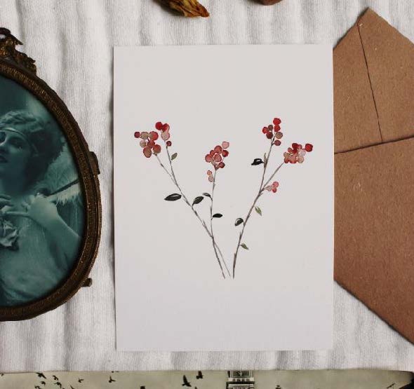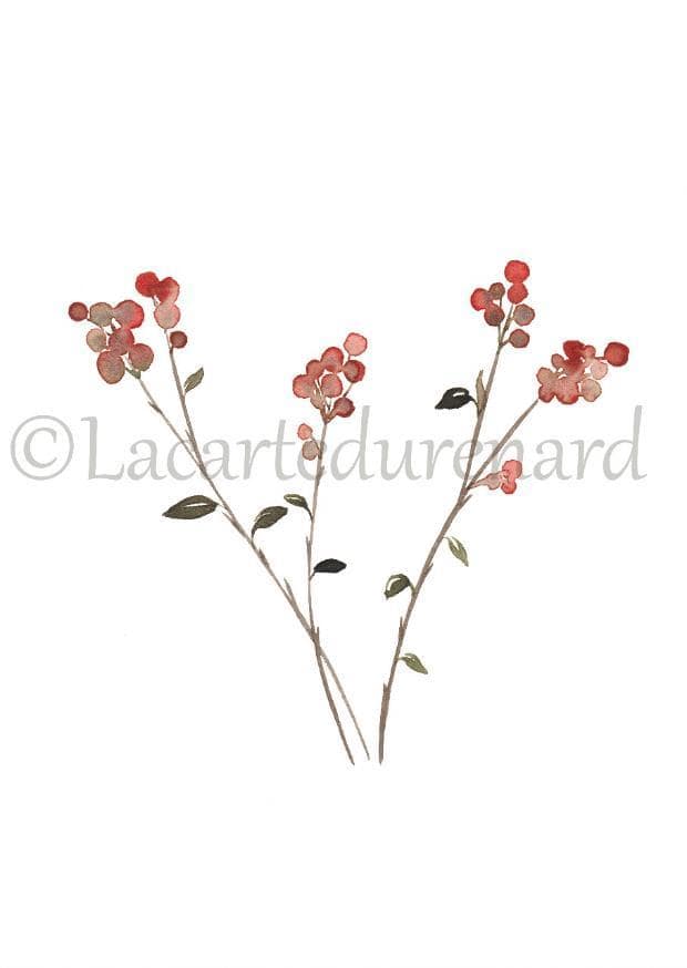 Carte Voeux Baies d’hiver est une carte postale / décoration murale illustrée à partir d’une aquarelle. Toutes les aquarelles sont réalisées par Marion, la créatrice de la carte du Renard. Les motifs sont réalisés à l’aquarelle puis numérisés et imprimés sur un papier 300g/m², légèrement texturé, verso inscriptible.