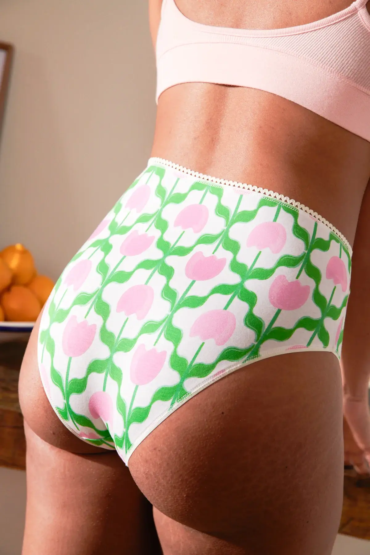 La culotte taille haute Tulipes roses en coton Bio, c’est celle qui couvre le ventre juuuste ce qu’il faut pour vous faire une véritable silhouette de pin-up HYPER glamour .
