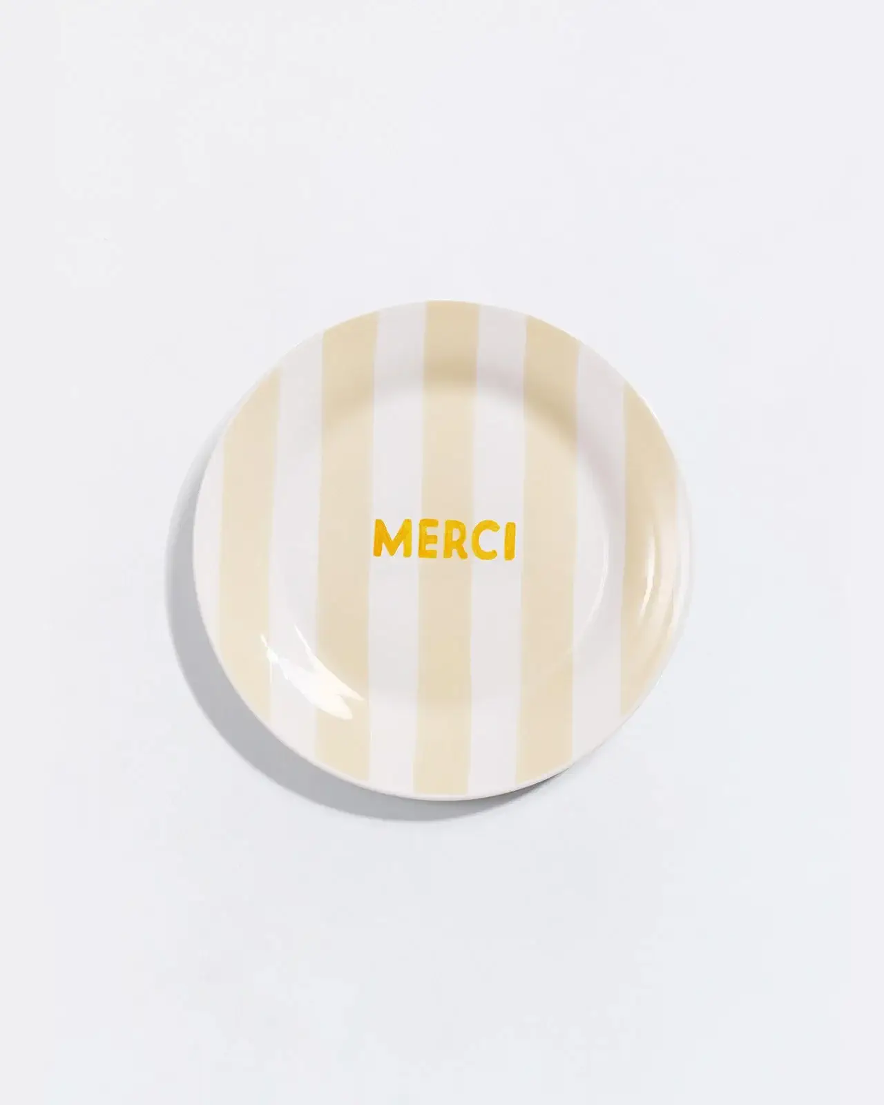 L’assiette – Merci fait parti d’un collection d’assiettes rayées en porcelaine. Elles sont d’un diamètre de 19 cm. Avec leur message mignon et original, ces assiettes sont une vague de douceur sur toute la ligne. Idéales pour associer, mix & matcher, créer des paires, dépareiller, s’amuser… à vous de jouer !