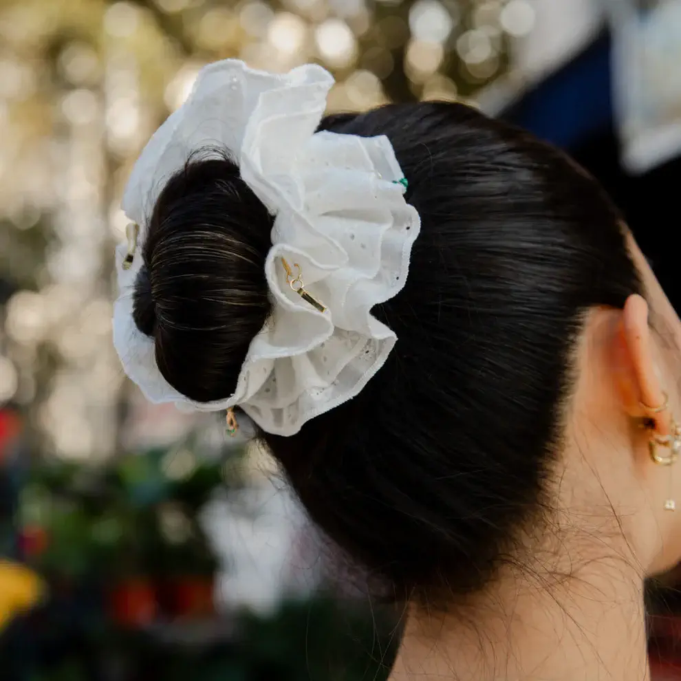 Maxi chouchou – Broderie anglaise blanc est fabriqué en France à la main, à partir d’un magnifique tissu upcyclé. La broderie anglaise est un intemporel léger, romantique et doux. C’est une pièce qui a du volume, idéale pour des cheveux moyens à épais.