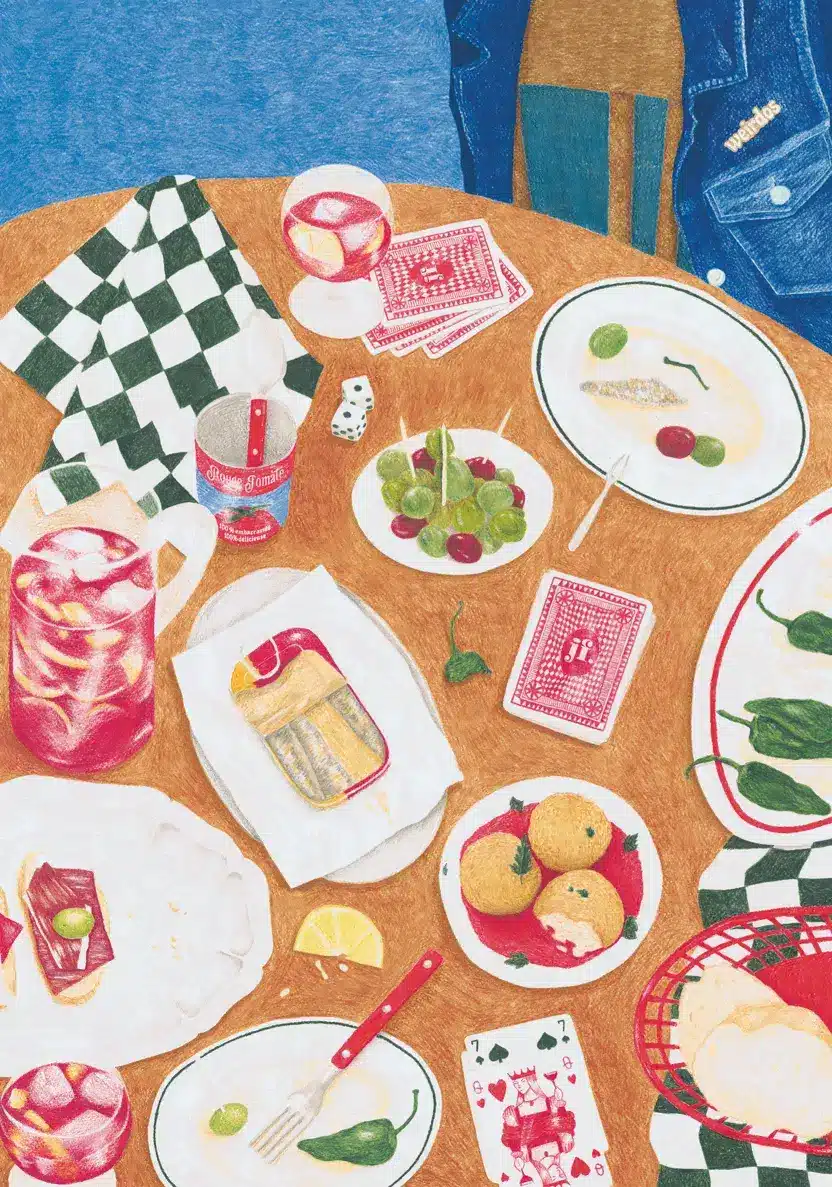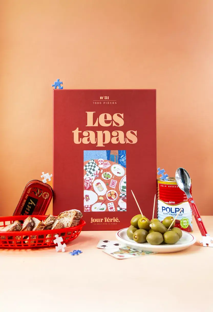 L’histoire du puzzle raconte : “La soirée a ce goût d’huile d’olive et d’abondance. On n’a pas pu résister à prendre toute la carte : patatas bravas, sardines, piments Padrón, croquetas… et sangria évidemment ! La soirée tapas, c’est le plaisir de manger avec les doigts sans savoir s’arrêter. Parler un peu fort, jouer en mangeant, rire et se resservir !”