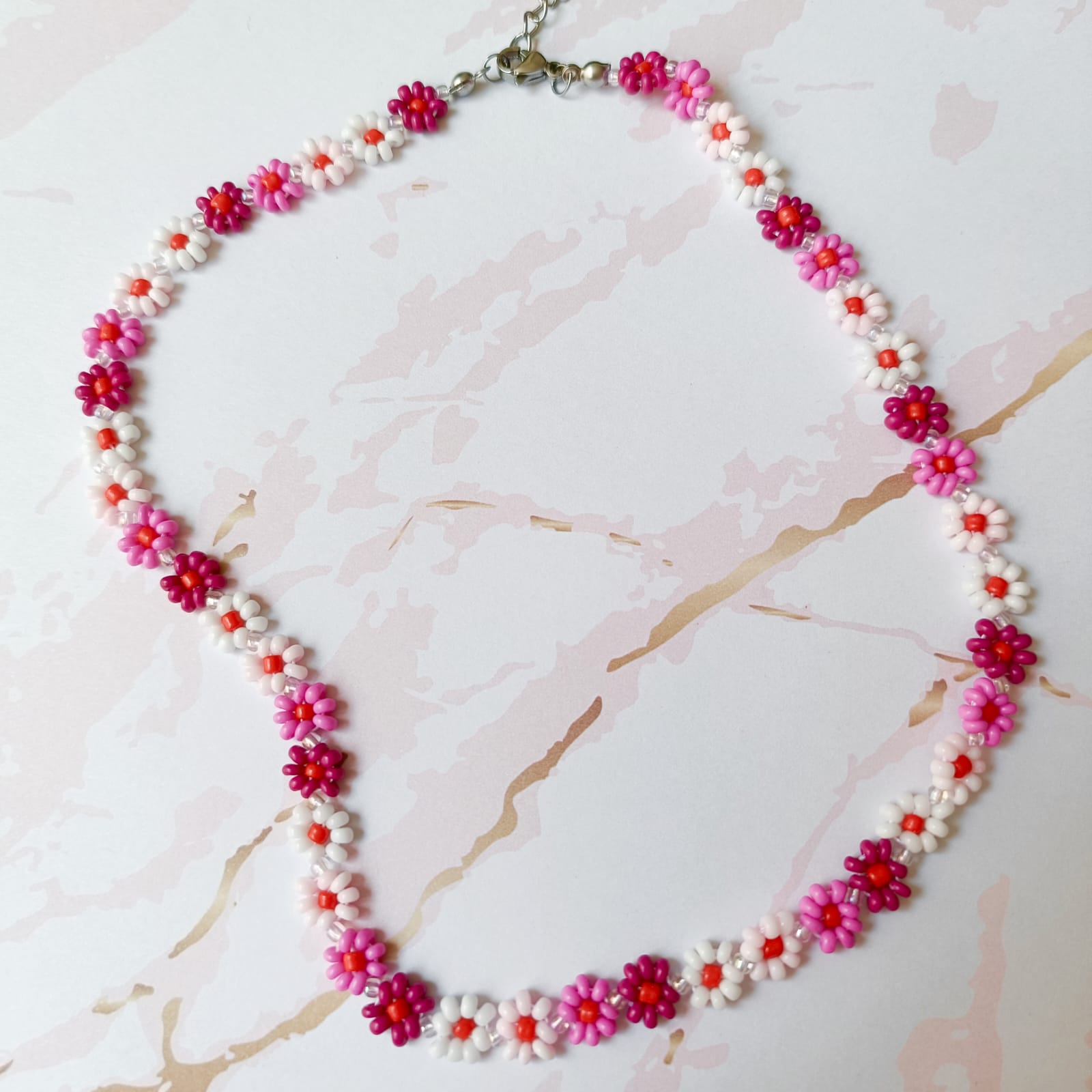 Ras du cou Daisy – Flamant est un collier brodées à la main avec des perles de diverses couleurs par les créatrice de Kolorya.