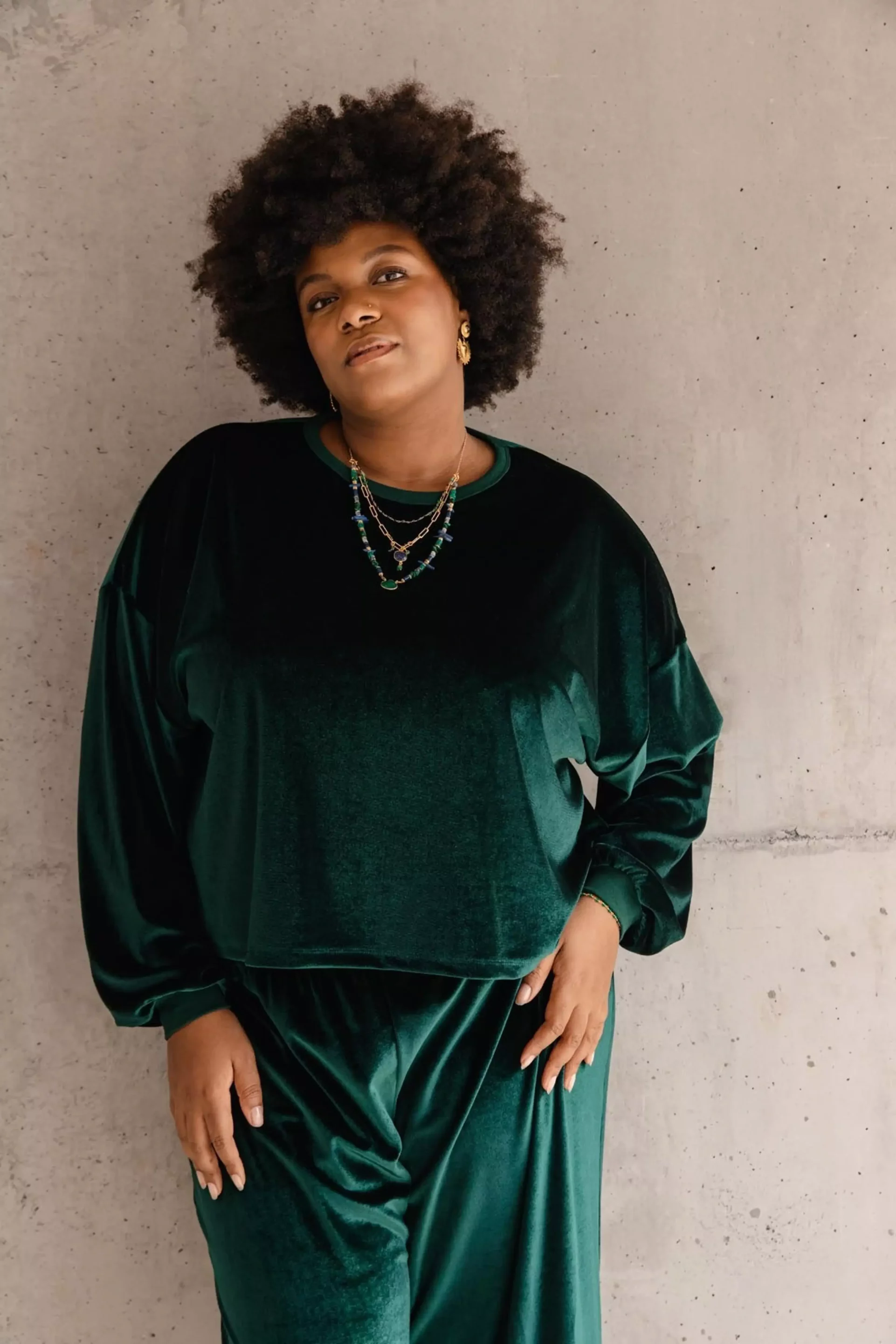 Le Sweat Velours – Vert Foncé avec son velours doux et aussi brillant que votre futur ! il capture toute l’énergie sophistiquée des 80s, mais retravaillé pour aujourd’hui. La coupe est fluide, bien pensée, et donne ce tombé parfait qui fait qu’on se sent à la fois suuuper cozy et ultra mode.