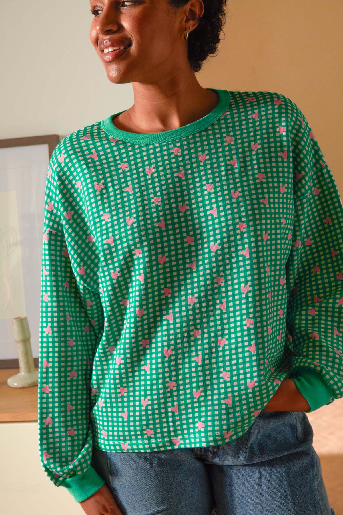 Sweat – Vichy Coeurs Vert c’est le sweat parfait ! Un coton BIO avec un gramage de 260 gr/m² qui a de la tenue, qui tombe bien, qui enveloppe sans étouffer. Il est assez structuré pour garder une jolie silhouette, mais suffisamment souple pour rester ultra confortable.